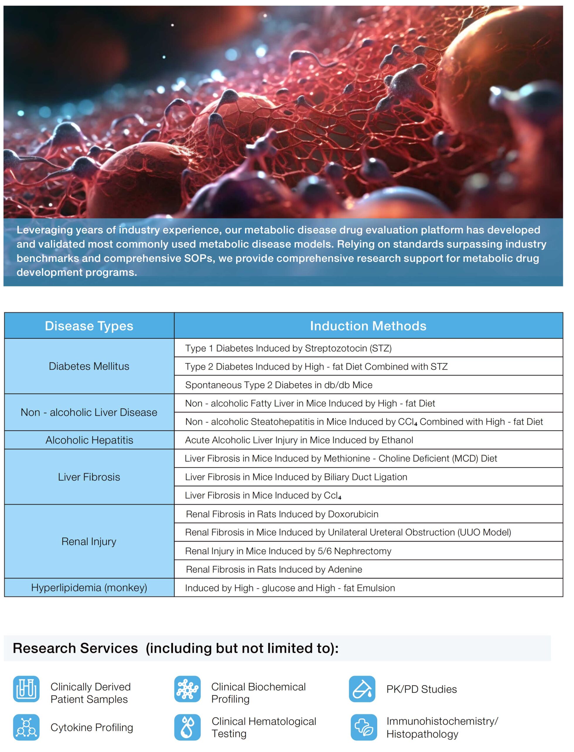 Addressing the core pain points of low clinical relevance and inadequate model predictability in liver disease drug development, we provide standardized models highly simulating the pathological characteristics of human diseases and a comprehensive efficacy evaluation system, shortening the R&D cycle by over 30% and reducing clinical failure risks.
