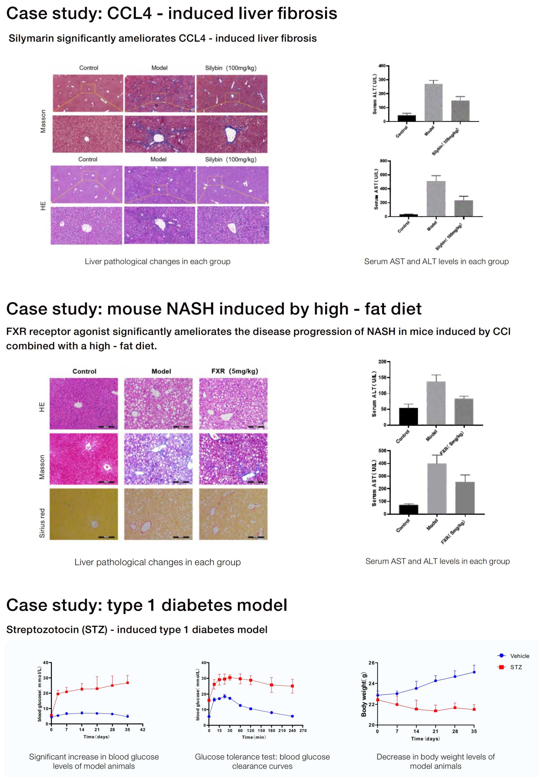 Liver Fibrosis Model: SD rats treated with intraperitoneal CCl₄ injection for 8 weeks, significantly increasing AST/ALT levels with pathological evidence of typical fibrotic changes.